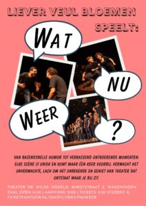 Niets ligt vast, behalve dat alles kan gebeuren. In Wat nu weer? nemen onze improvisatie-spelers je mee in korte én langere scènes die ter plekke ontstaan — gevoed door jouw ideeën. Een locatie, een relatie, een totaal absurd uitgangspunt? Jij roept, wij spelen.